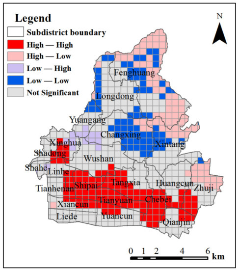 To identify the spatial differences in equity for dynamic transportation modes, we conducted a spatial correlation analysis. Park accessibility can reflect the supply and demand relationship between the population and PGS. From the perspective of supply and demand balance, areas with high population density also have high population activity; thus, the accessibility of PGS has a greater influence there. Therefore, to better understand the matching relationship between the supply of urban green space and the demand of the residential population, we conducted a correlation analysis between the accessibility distribution and population density.