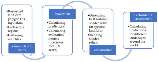 The proposed workflow is as follows (Figure 1): as input data, we use rasterized polygons (binary images) of landforms. After extracting the regions, we gather map tiles, and train the chosen convolutional neural network U-Net 10 times. Next, we calculate predictions for the whole area and evaluate the model by calculating the metrics (precision, recall, and f1 score). As the last step, we blend the various shaded reliefs based on relief shading “suitability” for different landforms. To assess the performance of the algorithm outside the sample area, we ran the model to obtain the predictions on other areas around the world.