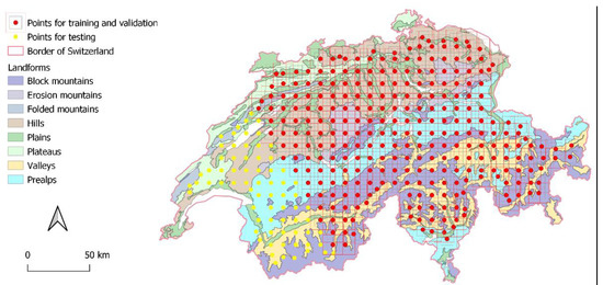 To provide the model with labels, we generated a 10 km grid of regularly distributed training points. Since the model would look as far as the padding areas, we had to make sure all the bounding boxes of 16 km (10 km and a padding of 3 km on both sides) fit completely within the Swiss border, i.e., where ground-truth data are present. For that reason, we manually moved close-to-the-border points away from the border and removed from the dataset those falling outside Switzerland. Out of 357 points, 80% (i.e., 286) of the points we choose for training and validation, while the other 20% of them will serve for the testing purposes (Figure 3). Diagonal cutting of the area ensures the presence of most of the landforms within both training and testing sets.