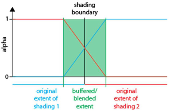 In cases where more than two shadings overlap, normalization of them is being carried out so that all alpha values sum up to 1 for each pixel. Once this is achieved, the different shadings can be blended according to Equation (1):