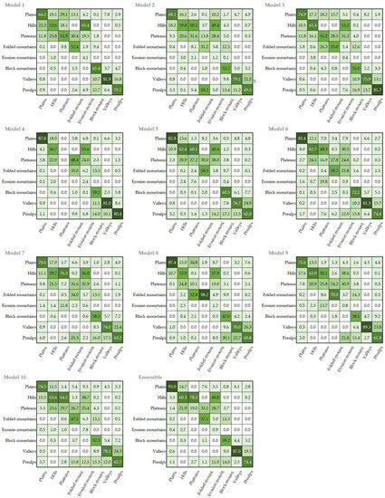 Furthermore, there are certain limitations regarding the recognition rates of the landforms. First, some landforms such as erosion mountains are in itself more challenging to recognize or classify due to their visual similarity with hilly areas. Additionally, there are also similar-looking places within hills, Prealps, and plateaus areas that cannot always be successfully distinguished from one another. In addition, in this approach we used a regular grid of training points, and a very different number of points fell within different landforms. At the same time, some landforms cover much larger areas than the others do. For example, the area covered by block mountains is more than 10 times larger than that covered by folded mountains (Table 4). As a result, the training cannot be equally efficient for all the landforms. Finally, there is an unpredictability on the subject of training: from one model to another, there might be very different results, i.e., one model may recognize plateaus, for instance, while another not at all.