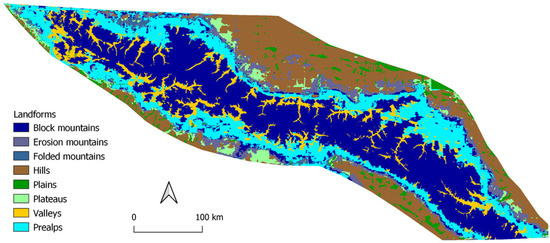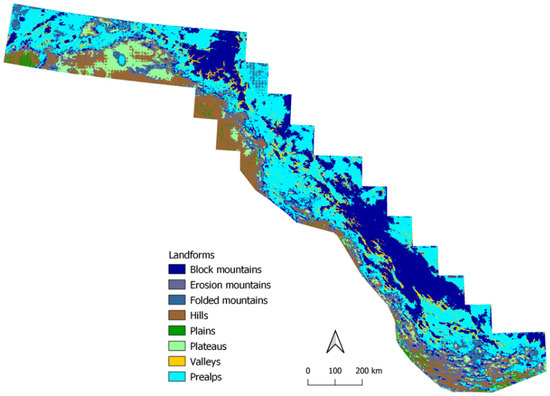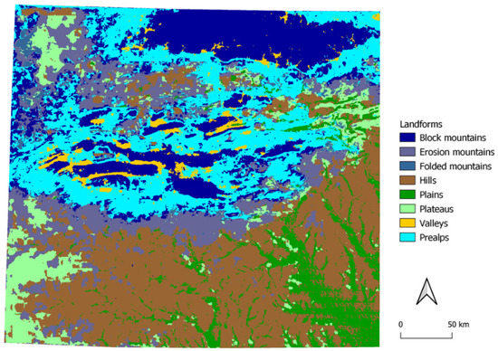 Given availability of data, we chose to train our model on the territory of Switzerland. We considered deriving source data from several maps such as biogeographical regions, landscape typologies, geomorphology, geology, tectonics, and settlement areas maps. Finally, we extracted the landforms as geomorphological units from the landscape typologies map [16] provided by the Atlas of Switzerland—online (Figure 2).