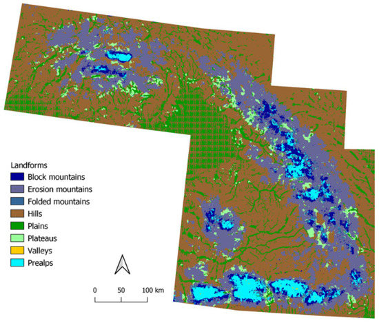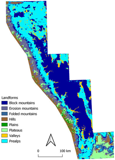 The Carpathians are a mountain range in the shape of an arc in the Central and Eastern Europe. It is lower compared to the Alps and has its highest peak of 2655 m in the norther part [26]. Its predictions (Figure 12) appear to change with elevation a lot, and most of the mountainous area are defined as erosion mountains, respectively, due to heights and similar rounded shape. The squared patterns over the plains are caused by tiling, and these artefacts occur, because the model did not “see” large areas of plains in the input dataset.