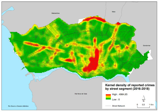 Porto’s kernel density estimation of reported crimes from 2016 to 2018 by street segment (source: authors, based on data reports of Porto’s Public Safety Police).