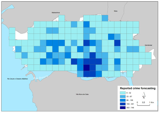 Then, to forecast the crime counts, random forest forecast tool within ArcGIS was used. Using the Breiman’s [81] extension of the random forest algorithm, the model forecasts the values of each space-time cube location, in this case performed on a cell size of 500m. The forecasting of crimes was performed for the twelve months after the dataset, from January 2019 to December 2019. Figure 4 demonstrates forecasted crime counts on the unseen test data set. The forecasted crime counts vary from 0 to 746 per square, with the highest crime density areas being in the center of the city and then along the main axes as previously identified. A new hotspot location has also been indicated.