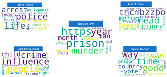 Topic modeling is a type of statistical modeling that identifies the “topics” that occur in a collection of documents. Latent dirichlet allocation (LDA) is the method of topic modeling used in this research study. After cleaning the data (stemming, lemmatization and vectorization) and tuning the hyper-parameters using grid search and cross-fold validation, the LDA model was run, and the value of Log likelihood −56,491 and perplexity 134.68 was computed. Topics with different weights of tweets were computed (Figure 6), and from these topics, concerns of dwellers may be understood. The higher the weight, the bigger the word in the word cloud. As above seen, ordinary people may not directly tweet about crime; newspapers seem mostly to do that in Porto. So, words such as theft, burglary, battery, violence are not very common in the topics. On the contrary, other words more related to the sense of insecurity, including crime, police, police arrest, prison, murder, influence, people or injury, have high weight in their respective topics (Some non-topics such as “thcmbzzbo” or “mgruq” appear in this figure. This can be derived from incorrect spellings or a “personal language” used in the tweets. If a term does not make sense and is not a known abbreviation or slang, it was removed during text preprocessing).