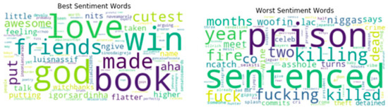 Sentiment analysis is the mining of text which identifies and extracts subjective information of sentiment/opinion that can be positive or negative. For this analysis, the AFINN lexicon-based method was used. AFINN is a list of words rated for valence with an integer between minus five (negative) and plus five (positive). Figure 7 presents the word clouds of positive and negative sentiments found in the Tweeter analysis. Tweets including words such as love, god, win, book or awesome have high frequency in the most positive sentiments, whereas tweets such as prison, sentenced, killed and profane make the most negative sentiments.