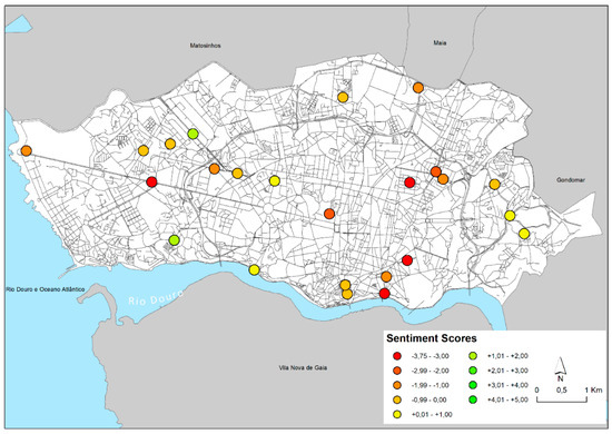 Figure 8 demonstrates that the tweets have mostly a negative sentiment (negative values), in line with what was discussed above. The most negative segments are tweeted actually a little outside the main registered crime hotspots of the city center, to the southeast (in the Fontainhas and Campo 24 de Agosto neighborhoods) and to the northwest (around the main football stadium of the city). Negative sentiments are also seen in the middle of Boavista Avenue, to the west, the new hotspot. On the contrary, the most positive sentiments (2 being the maximum found in the [−5; 5] scale) are located in non-crime areas, such as Lordelo parish, the commercial/industrial area northwest and around the Oriental City Park, at the eastern edge of the city.