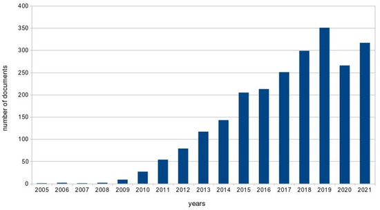 The Open Street Map (OSM) initiative started as one of the many opportunities offered by the virtual space of the World Wide Web, and probably it was initially perceived simply as a starting novelty in computer science. It is likely that the scientific community did not notice or underestimated its potential, because the area of volunteered geographical information was not as consolidated at that time, as outlined by Goodchild [2], due to the fact that enabling technologies and OSM’s popularity were both still emerging. This explains the slow scientific document production in the early years of OSM (Figure 1), when an average of three documents were published per year from 2004 to 2009. Then, documents were published with a more or less steady increase, possibly parallel to the distribution of the regions captured by OSM data (see also Supplementary Materials Figure S2).