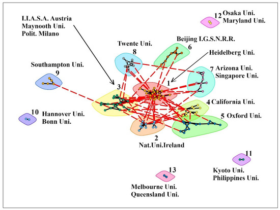 Collaboration network among the 190 most productive institutes, showing that there were eight large- to medium-sized and five small subnetworks. Clusters of institutes are highlighted by different coloured polygons. The title of the clusters is given by the institution with the higher degree of centrality (more than one in case of ex aequo). Within each cluster, there was no homogeneity on institute nationality. (1) Heidelberg University, Germany; (2) National University of Ireland; (3) Austria International Institute for Applied Systems Analysis; Maynooth University, Ireland; Politecnico di Milano, Italy; (4) California University, USA; (5) Oxford University, UK; (6) Beijing Institute of Geographic Sciences and Natural Resources Research, China; (7) Arizona State University, USA; National University of Singapore; (8) University of Twente, Netherlands; (9) Southampton University, UK; (10) Hannover Leibniz University, Germany; Bonn University, Germany; (11) Kyoto University, Japan; University of the Philippines; (12) Osaka University, Japan; Maryland University, Australia; (13) Melbourne University, Australia; Queensland University, Australia. See Supplementary Table S3 for a complete list of institutes.