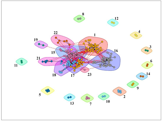 Collaboration network among the 201 most productive authors. The names of the authors were omitted, because the main focus is on the structure of the network, where it is possible to see a clump of clusters and several small “satellite” clusters. The clusters of authors are highlighted by different coloured polygons. See Supplementary Materials Table S4 for the authors’ names.