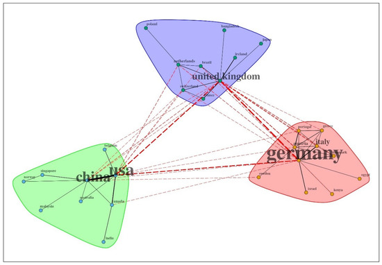 The countries network was composed of few nodes (i.e., 89), with the highest indexes of density, transitivity and degree of centralisation (0.05, 0.4, and 0.34, respectively) within the social structure of the OSM dataset and the shortest average path. It was structured into three main clusters grouping 28 countries, being the remaining 61 isolated nodes (Figure 5, Supplementary Materials Table S5).