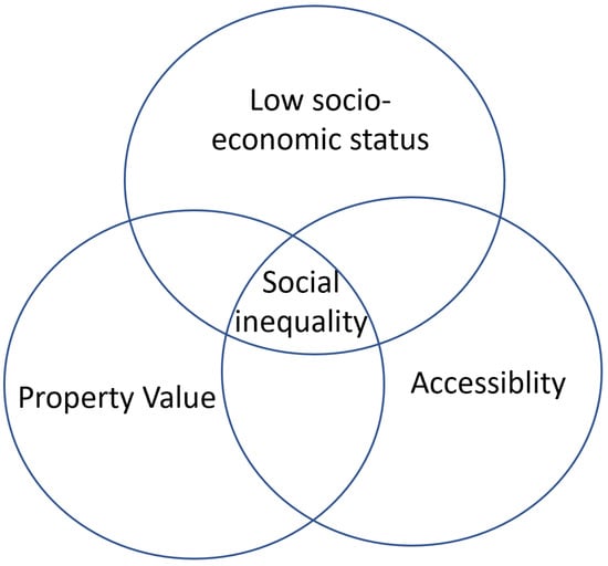 Disparities in access in cities imply a spatial mismatch of services, activities, and populations that may compound and enforce inequality [,,,]. Unequal accessibility to employment particularly has tangible manifestations within a city’s socioeconomic structures []. This has disproportionate effects on low-income and ethnic groups [], on the availability of affordable housing [,], the reinforcement of poverty cycles [,], and the differential outcomes of demographic groups that persist transgenerationally [].