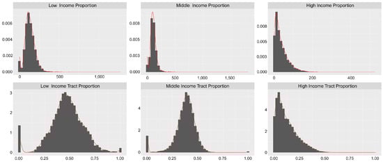 Income data for the 2016 census year was obtained at the SA1 level for the entirety of the Greater Sydney metropolitan area. The dataset refers to the ABS’ Total Personal Income dataset, INCP, which collects the gross personal income received each week by an individual []. The data was filtered by an individual’s place of usual residence to to reflect their residential locations. The INCP provided 17 income groups that ranged between AUD 0 to over AUD 3000 per week. These ranges were aggregated into three relative income groups, with income threshold adapted from the Australian Council of Social Services [] and the Property Council of Australia []. Low-income groups in this study are defined as individuals with a personal income of less than AUD 649 per week; middle-income groups ranged between AUD 650 to AUD 1999 per week; and high-income groups were those with incomes above these thresholds. The distributions of these income ranges are illustrated in Figure 2. Both the total income groups and and their relative census tract proportions are taken into consideration. A total of 1.5 million low-income—(), 1.3 million middle-income—(), and 0.4 million high-income—() individuals were enumerated in the dataset bringing the dataset size to approximately 3.2 million individuals.