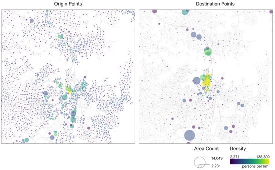 The Journey to Work dataset was further extended to obtain both origin and destination capacities; and this can be derived from the sum of flows at both origin and destination zones. Their inputs within the developed accessibility model will be discussed in the subsequent section. The flow matrix was then restructured into a simple dataframe, which enabled the dataset to be joined by their respective zone codes to the appropriate SA1 and DZN boundary vectors. This data layer was segmented with proprietary vector data of house footprints obtained from Geoscape to identify the highest density cluster of houses within each delineated boundary. A median-weighted centroid was appended within each SA1 and DZN building cluster to obtain a single point for each origin–destination zone (Figure 3).