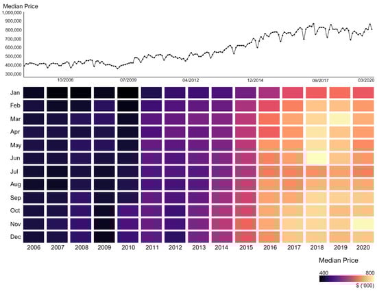 The house price data used in this study was obtained from the Australian Property Monitor (APM). This database comprised of approximately 1.82 million property sales ranging between 2006 and 2020. Figure 6 illustrates the change of sale prices for houses over the above time range. A subset of the house prices transacted in the two quarters of 2016 was used, which included 32,068 house price data points. This date range was chosen to coincide with the census data used. The dataset includes a large number of individual variables for each property, with key information on the physical characteristics, temporal distribution of sales, and contract sale prices being particularly relevant to this study. These sales data included both house and unit (also known as apartment) sales—from which, only houses were used.