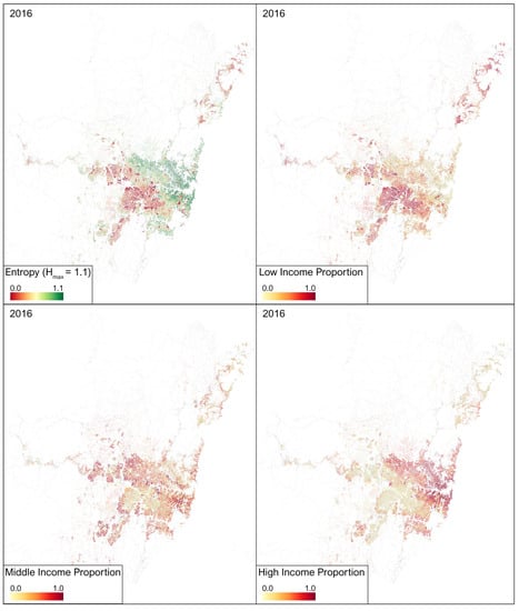 Entropy values are widely used as a statistical measure to describe specific attribute compositions within the urban system []. They are classically used to quantify disorder in an area; high entropy values equate to large variances within an area [,]. Neighbourhood entropy is a robust indicator of spatial variance; and it is widely applied in land-use analyses, population composition, and economic activity [,]. It is also used in segregation analyses to reflect the heterogeneity of populations in localised areas []. It offers a means to better understand diversity within a system. Here, the basic statistical form of entropy is adopted and applied to income groups.