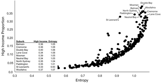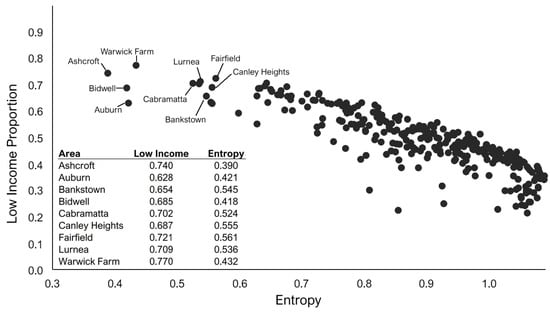 Table 3 quantifies the correlation coefficients between all income groups and their respective entropy values. What is first noticeable is the negative relationship between the distribution of low-income groups in Sydney with their middle-() and high-() income counterparts. This relationship is also seen with respect to entropy values (). These findings come in stark contrast to those values associated with high- and middle-income earners, with both groups displaying similar correlation coefficients to the diversity index. These findings indicate that Sydney’s income distribution appears to be highly asymmetric. Where it was initially thought that both high- and low-income groups would both display exiguous mixing (i.e., low entropy scores in both high- and low-income groups), this generalisation can only be extended to the latter. The results rather show that high-income groups in Sydney appear relatively more integrated at the metropolitan level, whereas low-income earners look to be concentrated in locations where those outside this income bracket remain unlikely to reside in.