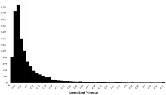 where  refers to the observed flows; and  is taken as a categorical predictor for all flows in each origin SA1 (i.e., each individual SA1 code). Having now appropriately specified the model, the parameters for  and  are solved for. The final parameter values used are 0.121 and −2.278, respectively. With obtained parameters, the production-constrained model can be calculated as denoted by Wilson [] with the appropriate balancing factor, . The preference for singly-constrained model over the attraction-production constraints is due to the unknown ’capacity’ of employment within each DZN area; which, if constrained, would have been arbitrary. The calibration of the above parameters allows accessibility scores to computed with the classical gravity potential model (Equation (4)). The obtained values are then standardised between 1 and 0 for ease of interpretation.