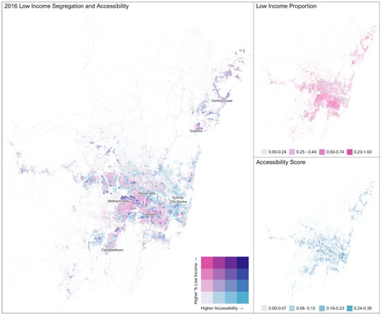 Our city of focus, Sydney, Australia, is considered one of the least affordable cities in the world [], and segregation is increasing in Sydney []. As such, it is important to have an enhanced understanding of the nexus between accessibility, income segregation, and house prices in this area given the paucity of existing research. Further, in the framework of the United Nations’ goal of achieving more inclusive economic development in cities, Sustainable Development Goal 11, understanding these dynamics may contribute more widely to more targeted housing policy and planning measures, as well as interventions.