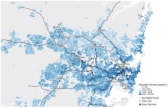 In the same vein, this paper aims to expand the discourse through the addition of accessibility as a variable that is complementary to those used by Pettit et al. [] and Mulley []. Employment accessibility is considered specifically, given its demonstrated links to economic productivity and upward mobility [,,,,]. An important contribution for the analysis conducted in this paper is the consideration of social inequality by examining Sydney’s neighbourhood income stratum and how this is reflected in property values.