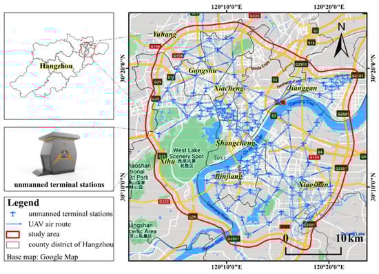 Hangzhou is a metropolis of East China in the southern Yangtze River Delta and is an important e-commerce center in China. Hangzhou, including its six core districts, has experienced rapid economic growth and urbanization, with its urbanization rate changed from 29.40% in 1990 to 79.5% in 2020, which has driven a rapid increase in the quality and level of supply of goods and services. In recent years, Hangzhou has focused on the digital economy, using 5G technology to provide development impetus for manufacturing, traditional trade, and urban governance with the aim of building a digital city with first-class digital economic concepts and technologies. These developments provide a strong base for the construction of city-level UAV smart logistics.