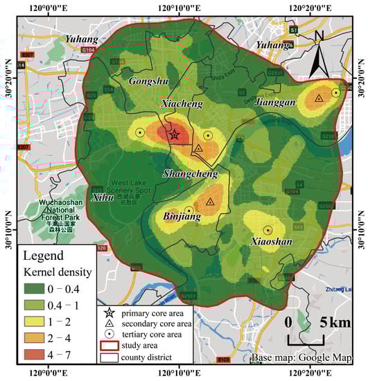 In the urban area of Hangzhou, the spatial distribution of the UAV logistics network was centered in the central city, however there was pattern within the central city, concentrated in residential land, business gathering places, IT parks, and other areas. According to the nuclear density estimation results, the UAV logistics network was divided into one primary core area (business and population concentration zones of Xihu District, Gongshu District, and Xiaocheng District), three secondary core areas (business and population concentration zone of Jianggan District and the IT park and business district concentration zone of Binjiang District), and five tertiary core areas (relatively scattered) (Figure 2).