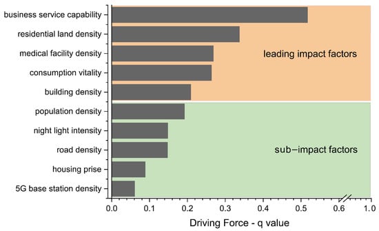 The factor detector can quantitatively detect the driving force of impact factors on explanatory variables and identify dominant factors affecting the spatial pattern of the explanatory variables by comparing the magnitude of the factor driving force. In this study, spatial indicators of urban UAV logistics calculated by KDE were taken as explanatory variables (Y) and the 10 impact factors were taken as independent variables (Table 1).