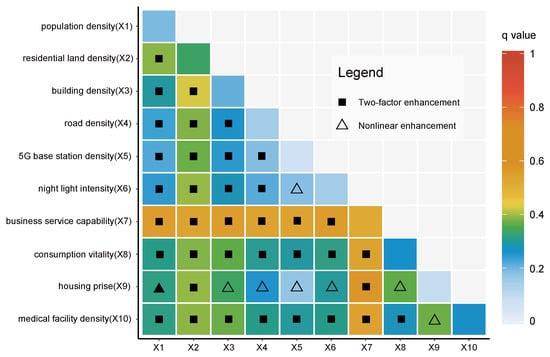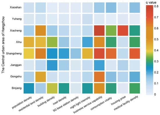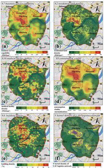 The Geodetector model used was the Geodetector package in R language; the relevant variables were input into the computational model and the factor detection results are shown in Figure 3. Among them, business services (X7), residential land density (X2), medical facility density (X10), consumption vitality (X8), and building density (X4) were the leading impact factors leading to the spatial pattern of the UAV logistics network in Hangzhou, and their corresponding values all exceeded 0.2 (0.5173, 0.3374, 0.2685, 0.2636 and 0.2090, respectively) and all of their p-values < 0.05. The q value of the business service driving factor was greater than 0.5, indicating that its explanatory power for the spatial divergence of the logistics network was more than 50%. From a geospatial perspective, as can be observed from Figure 4, there is a certain coupling between the spatial density of the logistics network and the spatial layout of the five leading impact factors. For example, the business service capability that drives the strongest forces has a strong spatial similarity, and this feature is detected by the q-value of the Geodetector.