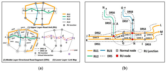 Figure 2a shows the basic component of MRI: a link map layer (the lower layer), a directional road segment layer (the middle layer), and an undirected road unit layer (the upper layer). An MRI system is generated by connecting the three layers, with an illustrative example shown in Figure 2b. The link map layer is derived from the original GIS map. Links, road units (RU), and directional road segments (DRSs) are three different analysis units in the MRI system.