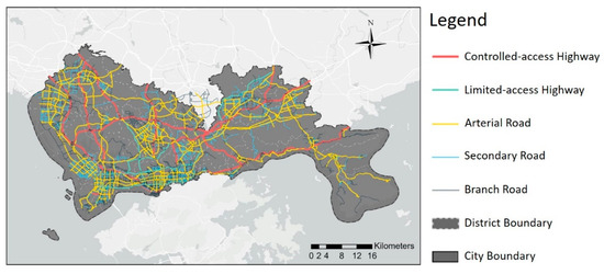 This study selects the main urban area of Shenzhen, China as the case study area. Shenzhen is located at the center of the Pearl River Delta in the south of China, with a land area of 1996.8 km2 and an urban population of over 17 million in 2021. It has six districts, including Luohu, Nanshan, Futian, Baoan, Longgang, and Yantian. It is the first Special Economic Zone (SEZ) city after the institution of reform and the Open-Door Policy in China, in 1979. In the past 30 years, the operation of a market economy has made Shenzhen’s economy develop rapidly, bringing with it a dramatic population increase and spatial expansion. Shenzhen has experienced rapid urbanization at a rate of more than 78% [33]. Its gross domestic product (GDP) increased from RMB 0.2 billion in 1979 to RMB 3066.48 billion in 2021. Shenzhen Metro is the seventh largest system in China, and embraces additional investments. In addition, Shenzhen has established trans-it-supportive policies to promote urban development along transit corridors and to facilitate TOD (transit-oriented development) around transit stations [43]. However, taking Luohu District for example, the coverage of rail stations within 500 m was only 48.6% in the built-up area before 2021 [44]. The mismatch between the demand and supply of rail services is obvious. The traffic condition in Shenzhen has not been improved since the rapid development of rail transit. The worsening of traffic congestion shows that public transportation is still not attractive, or it is maybe losing its appeal. Therefore, research into enhancing cab services as a link between buses and subways is still worthwhile.