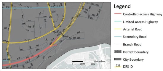 DRSy describes the yth route of the DRS. For a given DRSy in a map G, a grade value has been applied to indicate the road class, e.g., 1—highway, 2—arterial, 3—secondary, and 4—branch road. The lower the rank value, the higher its road condition and design speed.