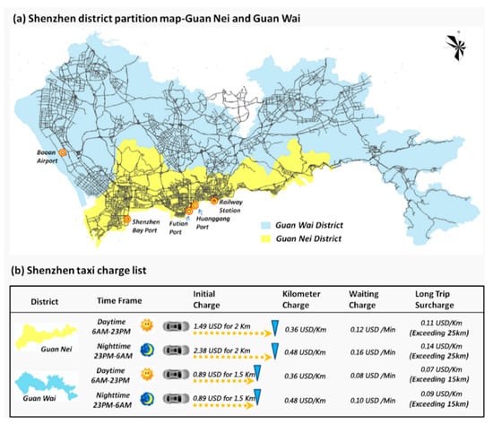 According to the taxi charging standards, we counted the payment of each route on the DRSs, based on the MRI system and taxi trace data. The charging standards were classified by the Guan Nei (Nanshan District, Luohu District, Futian District) and Guan Wai (Longgang District, Longhua District, Baoan District) districts, as shown in Figure 5a. The specifics of the charging standards are seen in Figure 5b. Each DRS’s total revenue was calculated by the sum of the route revenue with starting point on this segment.