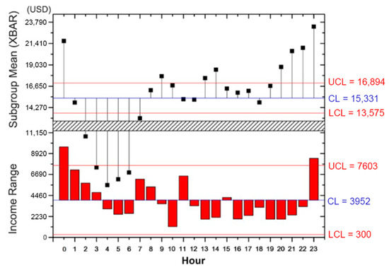 The total incomes of the DRSs where the taxi journey starts were aggregated. In this research, the sample size was 4661 among the 7862 full-scaled road networks in Shenzhen, where the DRS of the daily travel time was less than 5, namely, a weekly travel time of less than 35, this was excluded. The upper part of Figure 6 illustrates the fluctuation of the income within 24 h, and the lower part shows the hourly income range. To be more specific, the median hourly income for a week is USD 15331 (United States dollars), while the total income is at its lowest level at 4 a.m., suggesting the lowest travel demand at this time. For the morning hours, there is a significant increase in market income, starting at 7 a.m., and with a peak at 9 a.m., which may be largely related to the increase in commuter traffic by taxi in the morning peak. In the evening, the income pinnacle appears at 11 pm. The potential explanation would be the lack of public transportation at that time, because Shenzhen has a large number of leisure events at the end of the day, while the majority of public transportation has been closed.