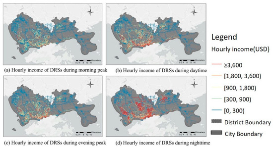 - The factors that influence incomes in different time periods are completely different. DRSs with more real estate/companies, hospitals with many upstream roads, degrees, and high road grades are more high-income DRSs during the morning peak. The DRSs with several realty/companies, hospitals, and parks nearby, as well as more downstream roads, more degrees, and higher road ranks, are high-income areas during the evening peak. During the daytime, high-income DRSs congregate in areas with a lot of real estate/companies and parks, as well as a lot of downstream roads, a lot of degrees, and a lot of long-distance travel. DRS income distribution is more scattered at night, with fewer impact factors, but a higher grade, more downstream, longer road length, and adjacent hotels, traffic stations, and hospitals corresponding to high-income road sections were also identified.