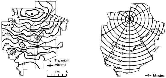 - Muller, J.C. The Mapping of Travel Time in Edmonton, Alberta. Can. Geogr. 1978, 22, 195–210. [Google Scholar] [CrossRef]