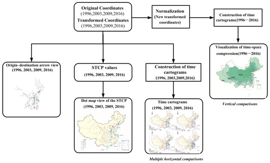 In order to visualize the “shrinking world” in different years on the same time scale and then describe the temporal-spatial changes in accessibility, the datasets for multiple years need to be reprocessed. The key problem is to select a basic data reference benchmark and then normalize the datasets for other years. In our research, we used the dataset in the earliest year (1996) as a reference. That is, the original data and the transformed coordinates in 1996 remained unchanged, and we calculated the deformed coordinates in 2003, 2009, and 2016. The following is an example of the recalculation process for new transformed coordinates in 2003.