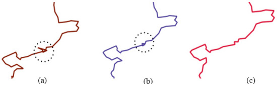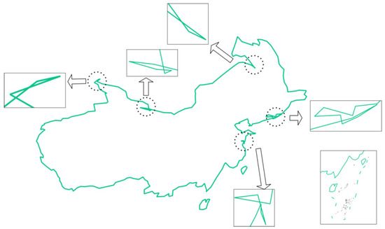 However, some topological errors will inevitably occur during the construction process. The main topological error for polygons is polygon boundary self-intersection, as shown in Figure 4. To reduce topological errors, further constraints are introduced. Bentley–Ottmann algorithm [42] is one of the most common algorithms for intersection detection of multiple line segments. However, when detecting polygon self-intersection, it will consider that polygon vertices are also self-intersection points. Therefore, polygon vertices need to be excluded when applying this algorithm. According to the polygon constraints, the continental boundary data are processed. Figure 5a–c shows the results of three iterations in turn. Topological errors are corrected, and the boundary is smoothed.