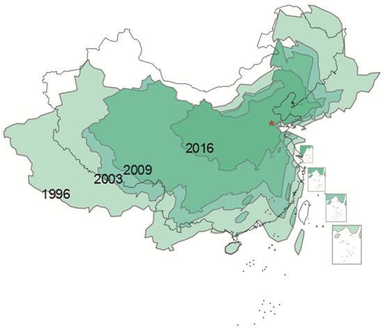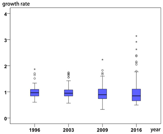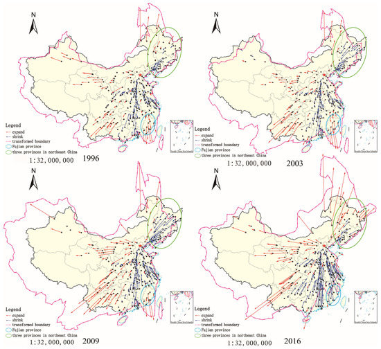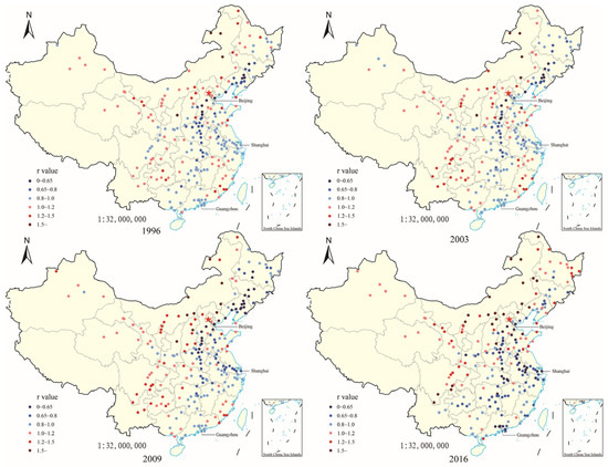 In Section 3, we introduced the meaning of the r value as STCP. The map visualization results of the changes in spatiotemporal conversion degree for each city in 1996, 2003, 2009, and 2016 are shown in Figure 8. The red dots indicate that the city expands outwards, and the expansion speed is lower than the NAL, while the blue dots indicate that the point shrinks inwards and the speed is higher than the NAL. The darker the color, the larger the degree. We can interpret from the visualizations in Figure 8 the following changes.