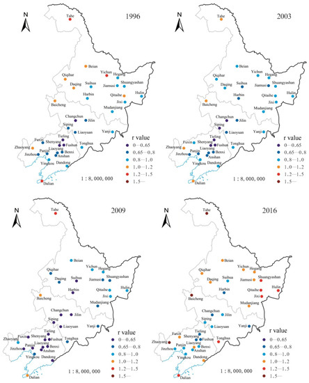 Table 3 lists travel times and the corresponding STCP values for each city in the three provinces in northeast China from 1996 to 2016. Figure 9 shows the map visualization results of the r value for all cities in these three provinces. According to the results, we can divide the traffic development in this region into two main stages. The first stage is the rapid development stage during the period 1996–2009. In this stage, the travel time shortened, and the r values of most cities were less than 1 and decreasing. This means that the traffic conditions of the entire northeast region were better than the NAL and the development speed was higher than the NAL. The second stage is the advantage slipping stage during the period 2009–2016. In this stage, the travel time did not change significantly, but the r value showed an increasing trend, and even the r value of some cities began to reach more than 1. This indicates not only that the traffic development speed was significantly lower than the NAL, but also that the dominant position was shrinking and some cities’ traffic conditions had even begun to fall below the NAL.