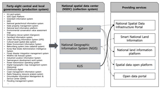 The spatial data production system is connected with the interlink integration systems, namely, the NGP (National Geospatial Program) and the NGIS (National Geographic Information System). The NGP was developed by the Ministry of Land, Infrastructure and Transport and the Ministry of Public Administration and Security to secure the infrastructure of spatial data implemented for each organization and utilize spatial data for administrative work in City/Do and Si/Gun/Gu. The NGIS is an information collection system where systems that manage national land information are linked; these systems include the digital topographic management system of local governments, the Korea Real Estate Administration Intelligence System, and the farmland information system.