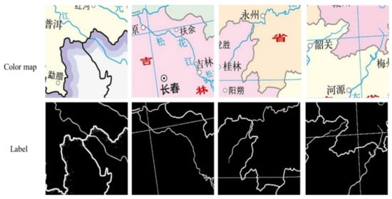 The deep learning method can form more abstract high-level representation attribute categories or features by combining low-level features, which provides the possibility for the accurate extraction of raster map line features []. In particular, the emergence of convolutional neural networks (CNNs) and fully convolutional neural networks (FCNs) realizes the classification of every pixel of the image—that is, the semantic segmentation of the image. This is helpful in image processing. Duan et al. [] used convolutional neural networks to build a system for automatic recognition of geographical features on historical maps. Uhl et al. [] used the LeNet network to identify map symbols, and CNN to identify buildings and urban areas on the map []. All these studies indicate that convolutional neural networks have effective applications in map image processing.