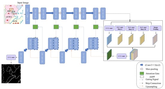 Semantic segmentation uses deep learning technology for autonomous feature learning of input data. The low-level, middle-level, and high-level features are extracted from the image to consider local and global features at the same time. By fusing the features of different levels and regions, the implicit contextual information in the image is captured, thus realizing the segmentation, cognition, and understanding of the image at a higher level. At present, many deep learning image segmentation networks are the improvement of full convolutional neural networks. The U-Net network is the classic encoder and decoder network, and there are many improved networks based on it, such as U-Net ++ [] and U-Net +++, which can realize the convolution operation of images of any size and obtain the contextual information of the image through the maximum pooling sampling to reduce the amount of computation []. However, due to the repeated use of pooling operations in U-Net, the resolution of feature maps is reduced, leading to rough predicted results. Using down-sampling operations to extract abstract semantic information as features will lead to the loss of some detailed semantic information, causing the problem of missing details and semantic ambiguity in the extracted results. When the U-Net model is directly used to extract line features of the raster map, there will be text interference and broken lines. Therefore, it is necessary to combine other network modules to improve the performance.