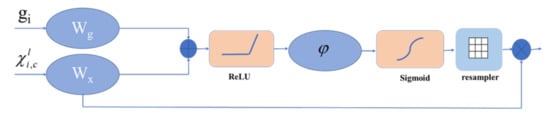 The decoder and the encoder belong to a symmetric structure, and the decoder part also contains four blocks. Each block up-samples the feature map using 3 × 3 up-convolution, and the number of filters in the convolution layer is 256, 128, 64, and 32. Then, the feature map from the corresponding layer in the contracting path is cropped and concatenated onto the up-sampled feature map. The initialization mode of the convolution kernel is still set as He initialization, and the feature graph is filled with padding. Finally, a 1 × 1 convolution operation is connected to change the channel number of the feature graph into the category number of classification, and Sigmoid is used for the activation function. The AG module is described in detail in the following sections.