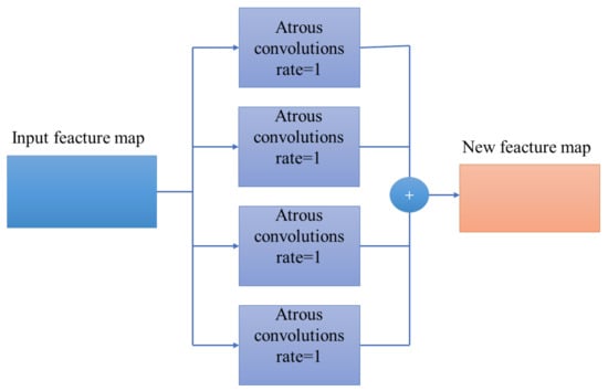 The latest ASPP module was proposed by Chen et al. []. It integrates multi-scale information into ASPP through parallel multiple cavities’ convolution with different proportions to obtain fine segmentation results. The ASPP module has better detection performance for map line features with different scale shapes.