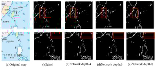 Figure 6 shows the comparison of map line feature extraction results of different networks. The red boxes in the figure indicate the obvious differences. As can be seen from the figure, when the network depth is 4, the interference of text information in the extraction results is more serious, the extraction effect of map line features details is not favorable, and there is noise interference. When the network depth is 6, the extraction result is better than when the network depth is 4, but there still exists the interference of text. When the network depth is 8, there is almost no text interference in the network, and the details of online feature extraction are also better. The results show that with the deepening of the network, the text interference gradually decreases, and the extracted lines become more and more complete.