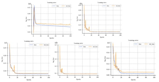 Learning curve of network training with different modules: (a) the learning curve of U-Net, (b) the learning curve of U_Net_D, (c) the learning curve of U_Net_A, (d) the learning curve of U_Net_A_D, and (e) the learning curve of U_Net_A_D_AS.