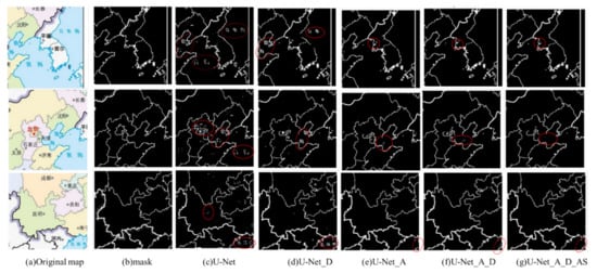 The map line feature extraction results after adding different modules are shown in Figure 8. As can be seen from the resulting figure, the extracted line features also contain certain text information, marked with red circles in the figure. Figure 8g is the extraction result of the model proposed in this paper. It can be seen from the resulting figure that the influence of characters has been greatly improved.