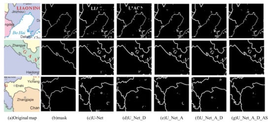 In this paper, we introduced ASPP and AG modules into the traditional U-Net network, constructed the sample set of map line feature extraction, and proposed an improved U-Net network model for scanning map line feature extraction. The AG module increased the weight of line feature extraction and reduced the interference of background text. The ASPP module was used to extract features of different scales to improve the segmentation effect. Through comparative analysis of experiments designed with different network depths, network modules, and robustness testing, our conclusions are as follows: