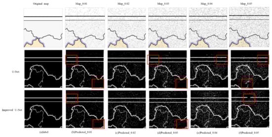 Figure 10 shows the line feature extraction results of a sample in the test set. Figure 10a is the label of the selected sample, and Figure 10b–f show the extraction results of map line features of color maps with SNRs of 0.01, 0.02, 0.03, 0.04, and 0.05, with the original U-Net network and improved U-Net network.